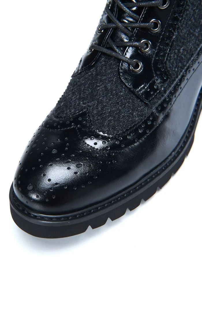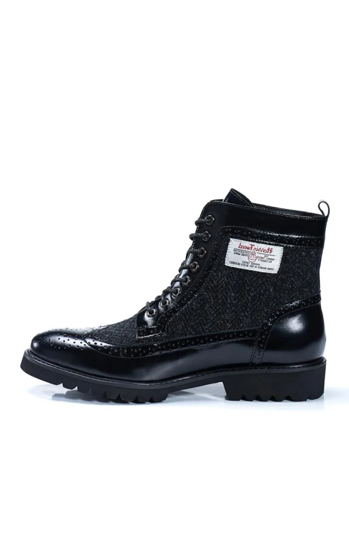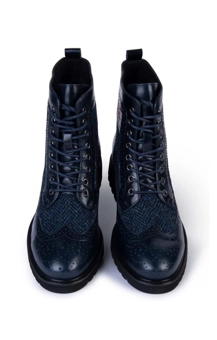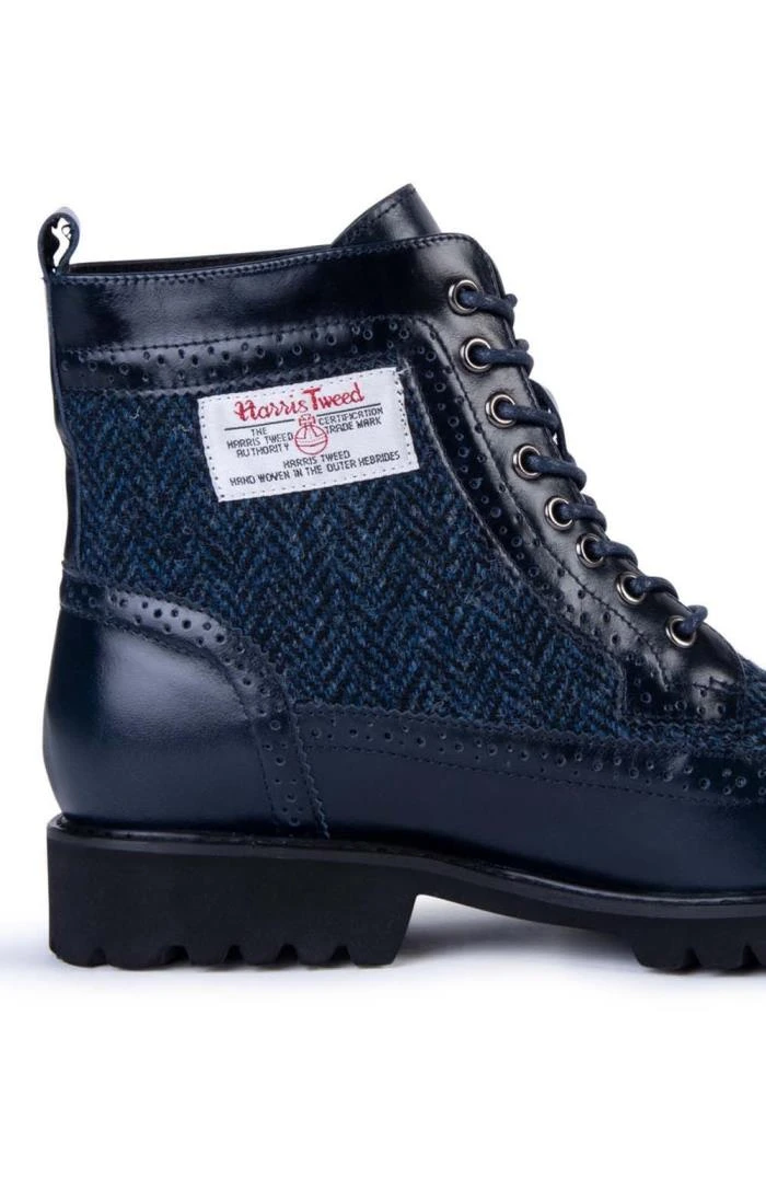 Enjoy the piles of crunchy autumn leaves with the perfectly warm and comfortable Huntress boots. Designed with a full length laced fastening to the front, these stylish boots feature a delicately brogued leather toe and trim, with iconic Harris Tweed panels around the main body.