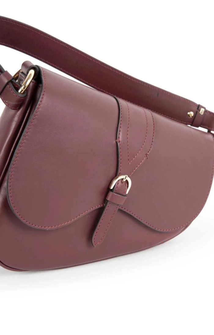 Add a touch of quirky personality to your style with this unique asymmetrical bag in premium leather, hand stitched to an incredibly high standard. Featuring beautifully contrasting gold-toned hardware, this bag benefits from a secure buckle fastener over the elegant wave design of the flap top.