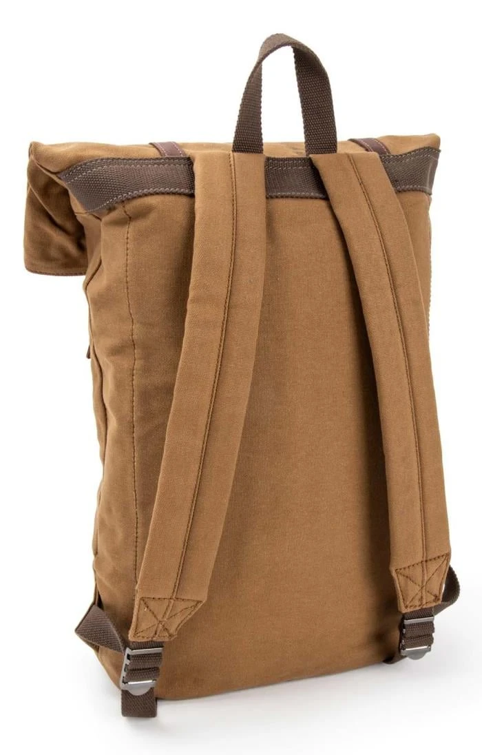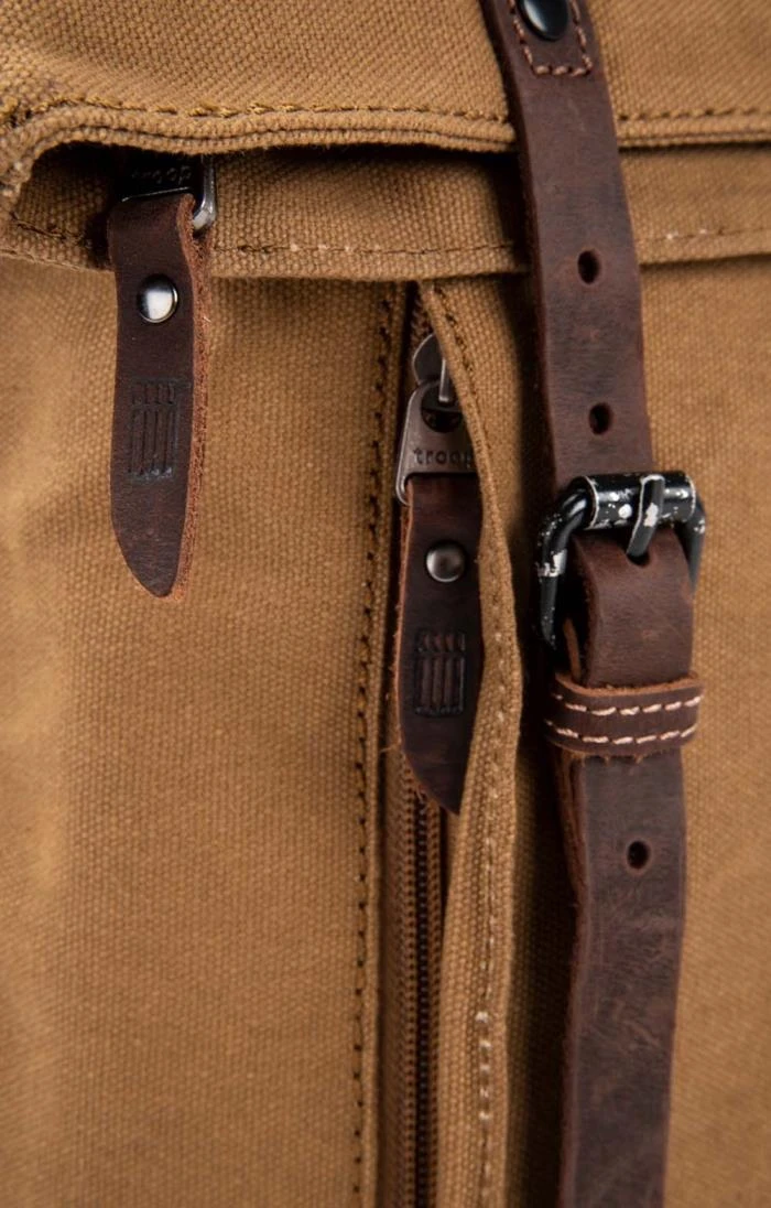 Constructed of a tough yet stylish waxed cotton canvas with a vintage distressed look, the Troop flapover backpack makes a rugged and practical everyday companion. The spacious main compartment has a zipped top closure and a folding top that forms a front flap – this unusual design means that when the flap is left unfolded the bag is 63cm in height, which provides greater versatility if you have to carry tall items. Adjustable shoulder straps ensure a comfortable fit, while a top carry handle gives added versatility. Two large front zip pockets (one of which is large enough to carry A4 books) provide generous extra storage over and above the cotton-lined main compartment, which itself features an internal zipped pocket and padded laptop compartment (24 x 44cm with a tape closure tab at 30cm).