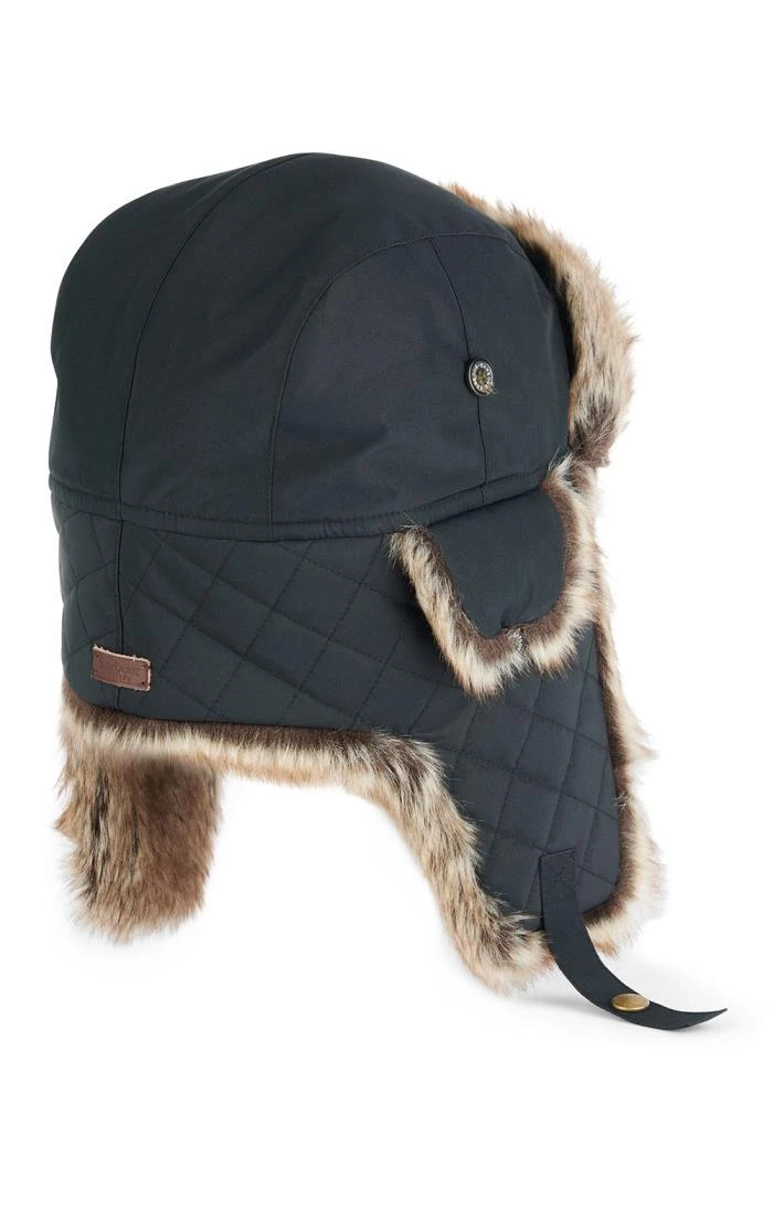 Sporting snug faux fur to keep you warm in the coldest weather, this men’s Barbour Cleadon trapper hat is a contemporary upgrade on a popular classic. Resistant to showers and with an adjustable chin strap in case of strong winds, this cosy hat features a quilted outer, a fleece-lined inner and is finished with the Barbour logo on an embossed badge at the rear.
