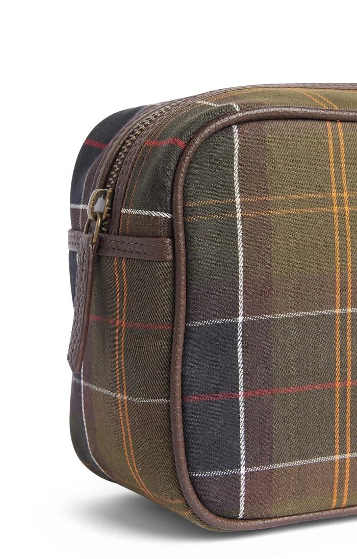 Exquisitely crafted in an exclusive print, this classic men’s Barbour tartan and leather washbag is just what you need for your next trip away. With sleek lines and compact style, this very desirable toiletries bag also features a grab handle and textured leather trim. One inner and one outer zipped pocket allow for the safe storage of smaller items, and the piece is finished with an embossed badge on the front.