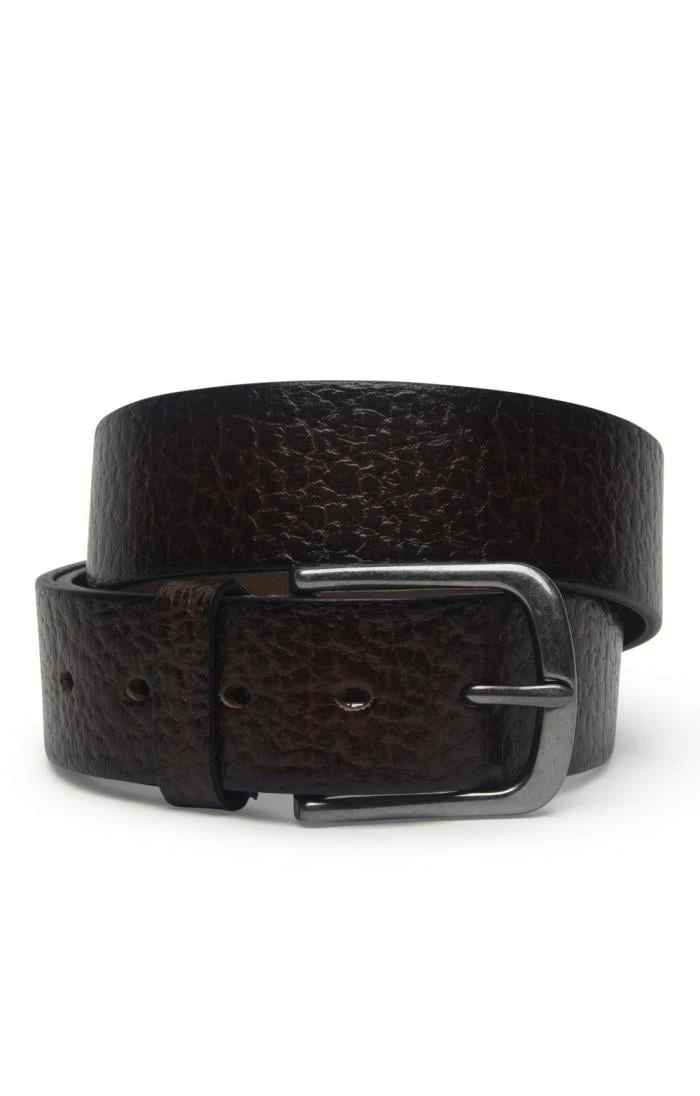 The quality of Lindenmann leather belts is unsurpassed, and this men’s full grain leather belt with textured detailing is no exception. Crafted with an open edge and full-length embossing, it features an antique silver buckle with an adjustable strap catch and a branded metal rivet.