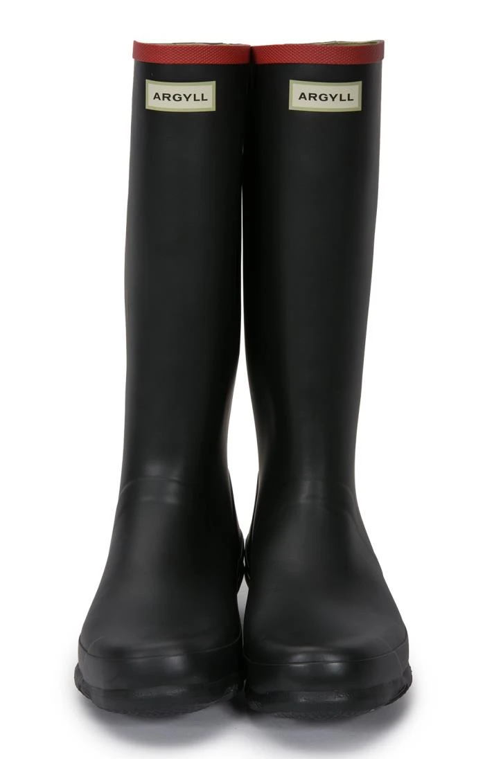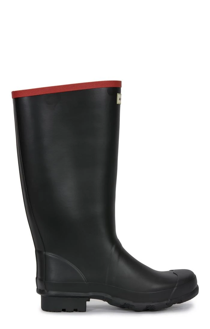 A knee-high Wellington boot for challenging environments and farming this design is made from heavy-duty rubber. The matte-finish boot is completed with a band of red detailing the top.