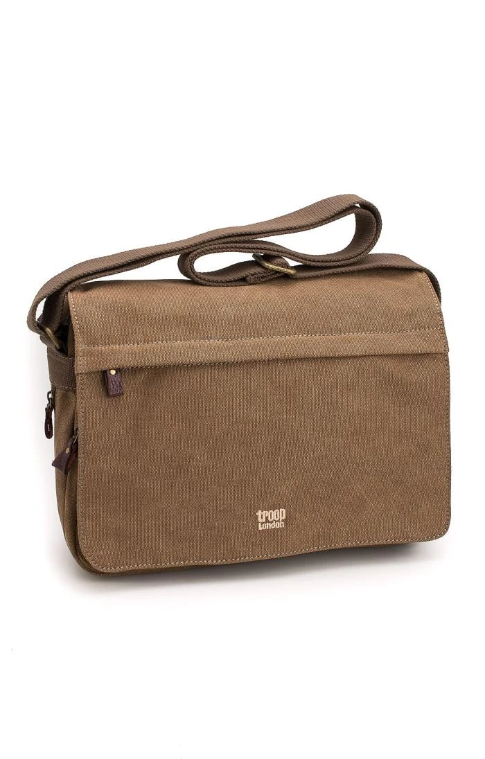 Sleek and strong, this messenger bag offers a deep and spacious expandable main compartment and a padded and protected laptop compartment. Both of these compartments are secured with zips and the main compartment is also secured with a Velcro front flap. Furthermore, the shoulder strap is adjustable and padded for extra comfort. Constructed in the finest cotton canvas and finished with brass plated buckles, this bag is suitable for work or play and makes a welcome addition to any wardrobe.