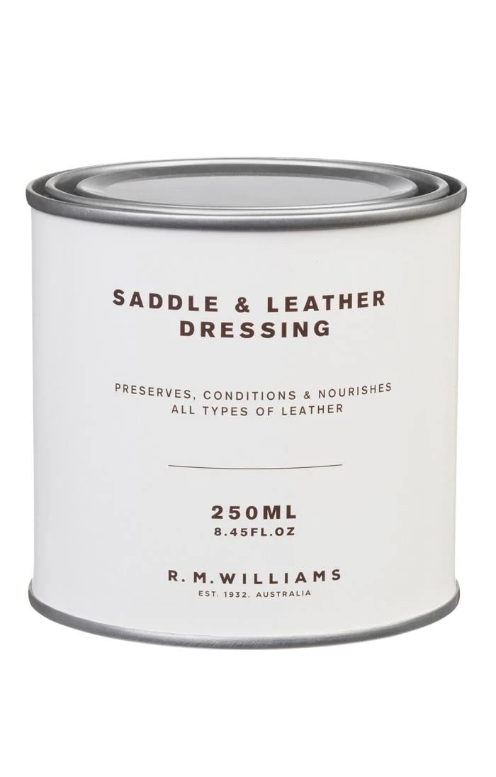 R. M. Williams Saddle Dressing is a popular dressing used to condition and nourish leather, as well as to preserve all types of leather from harsh climates. A creamy dressing which penetrates and protects the leather, without over softening it, keeping your leather in good, supple condition.