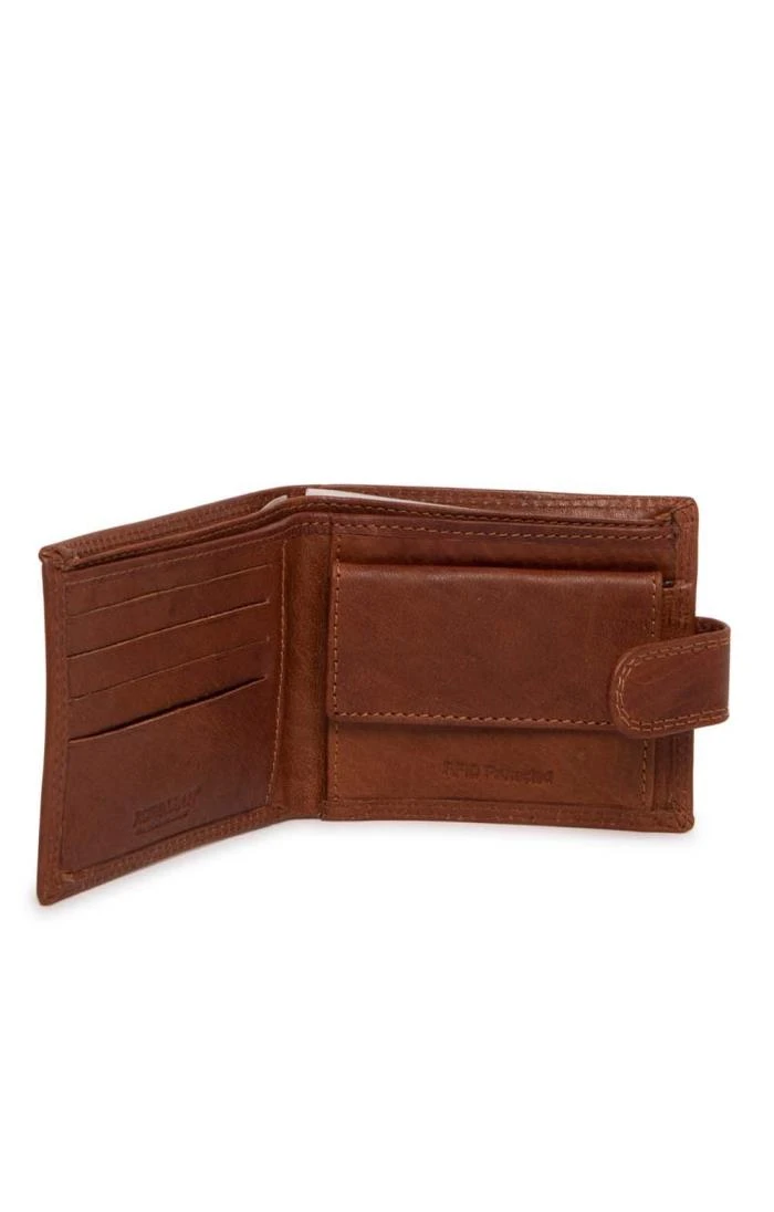 Premium stitched leather polished to a smooth matt finish makes this tabbed flip up wallet from Rowallan perfectly sophisticated. Boasting multiple card slots with a flip up double layer on one side and a full length note pocket, this wallet closes with a small leather tab for extra security.