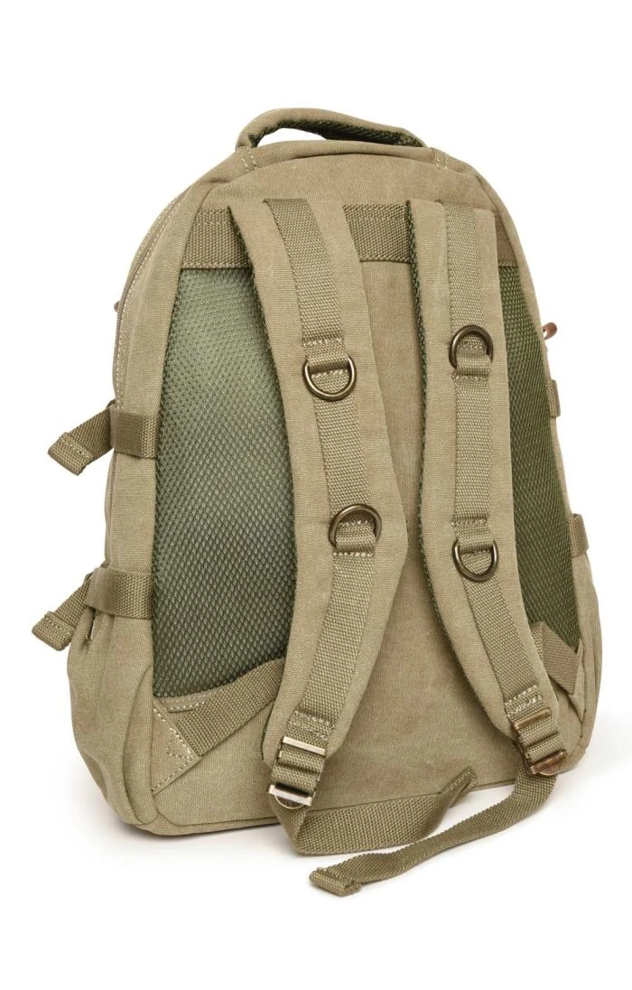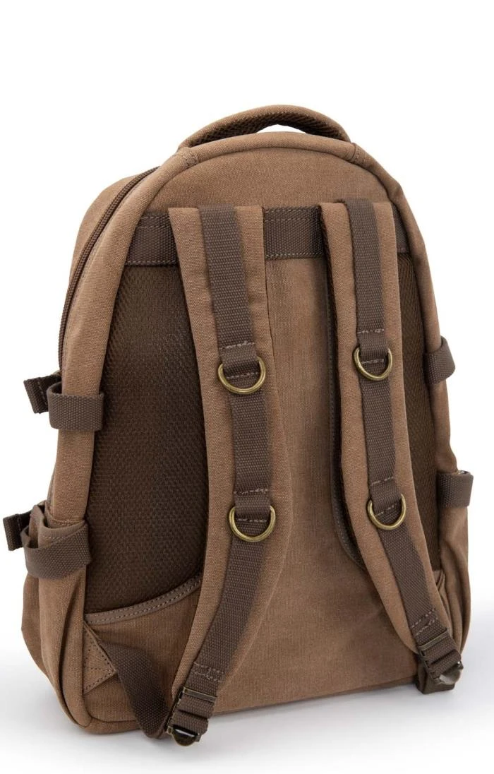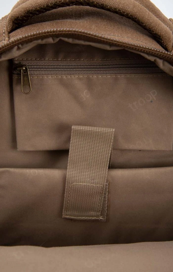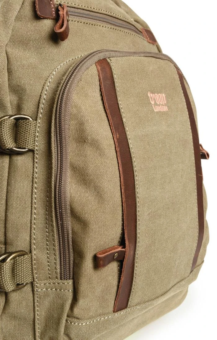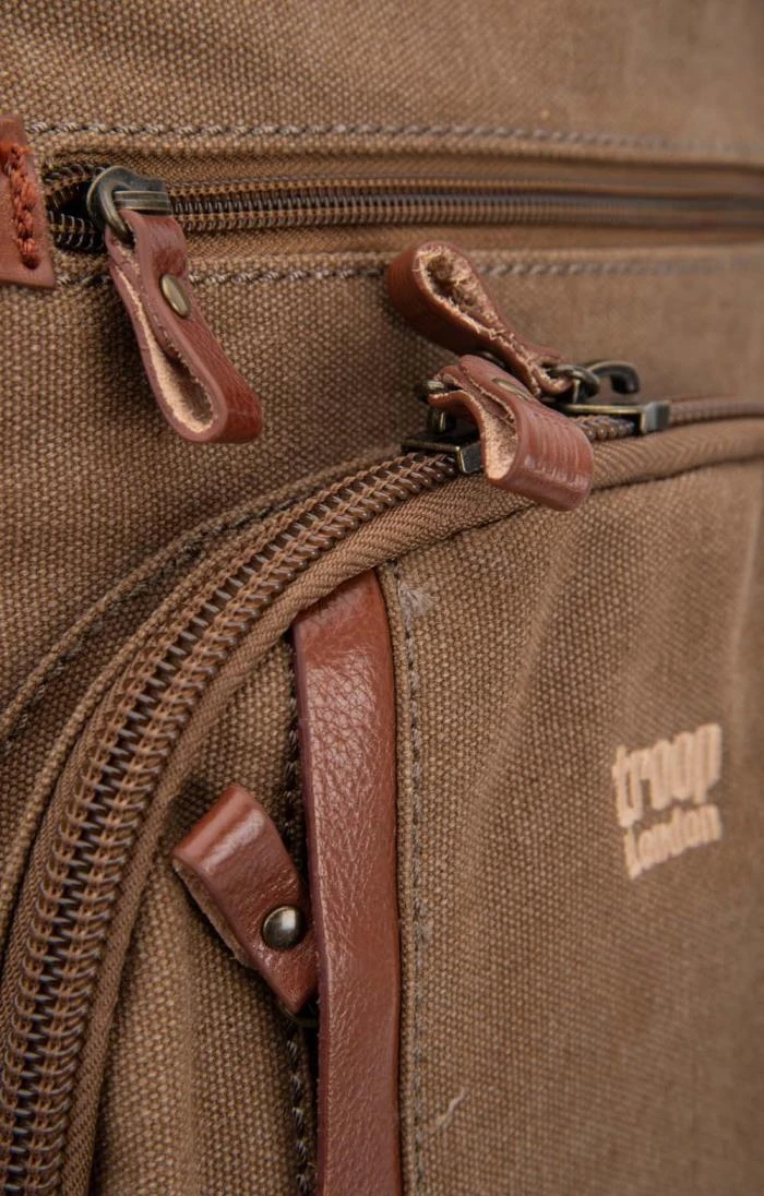 The Troop comfort backpack is made from durable yet stylish canvas featuring genuine leather trims and brass plated metal fittings. Eminently practical, it has adjustable padded back straps, a rear zipped compartment with a vertical zip pocket on the back and a further zipped pocket above it, two useful side pockets, side adjusting straps to prevent your valuables from moving around too much and a soft but sturdy carrying handle on top. Inside the front compartment there’s an organiser for your pens and a phone pocket. The main body of the bag is lined with nylon with a waterproof coating and has a padded laptop compartment that’s 27 x 30 x 4cm with a diagonal length of 39cm. There’s also a small zipped security pocket inside for storing your valuables.