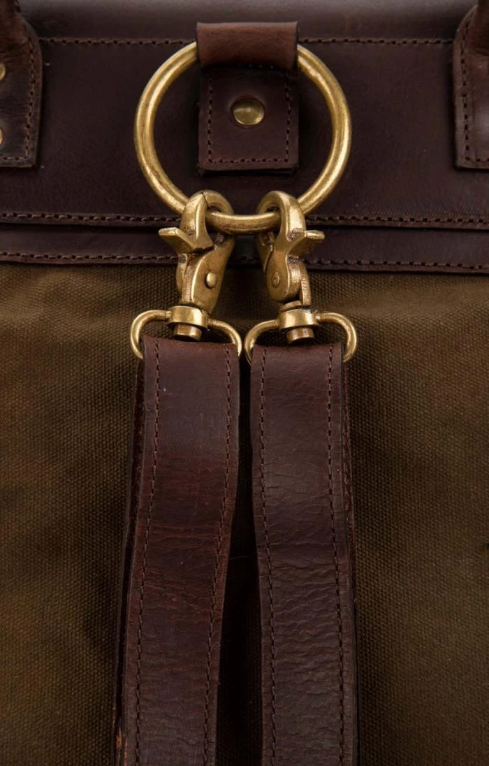 Crafted from heavyweight waxed canvas with a premium leather trim, this waxed canvas satchel bag is ideal for someone who appreciates style. Fitted with strong antique brass hardware, a top carry handle and an adjustable shoulder strap, the bag is sturdy and durable and ready for travelling the world or simply heading with you to work.
